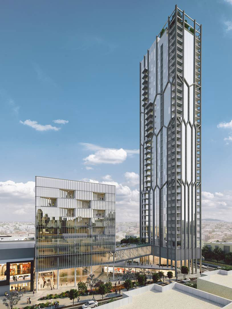 Structural planning of two buildings: a 40-story residential building and a 15-story office building above commercial areas on the ground floor and three floors of underground parking.